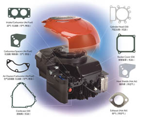 1、空氣濾清器(Air cleaner gasket) 2、化油器(Carburetor gasket) 3、進氣口(Intake gasket) 4、氣門室蓋(Valve cover gasket) 5、通風孔(Breather gasket) 6、呼吸槽(Breather passage gasket) 7、曲軸箱體(Crankcase gasket) |