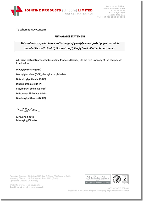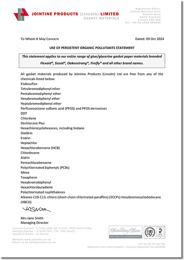 JOINTINE是全球領(lǐng)先的高質(zhì)量耐油植物纖維紙墊片材料制造商,其名下的品牌產(chǎn)品Flexoid/福來德、Cranflex是一種環(huán)保的耐油纖維紙墊片材料,可廣泛應(yīng)用于汽車、發(fā)動機、傳動設(shè)備等行業(yè),如下是JOINTINE發(fā)布的環(huán)保聲明函。